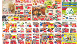 アマノからのお知らせ チラシ「秋のうまいもの市」 10/1(水)~10/5(日)5日間のお買得! 10/1~秋のうまいもの市 表 10/1~秋のうまいもの市 裏 2025.10.01 アマノからのお知らせ